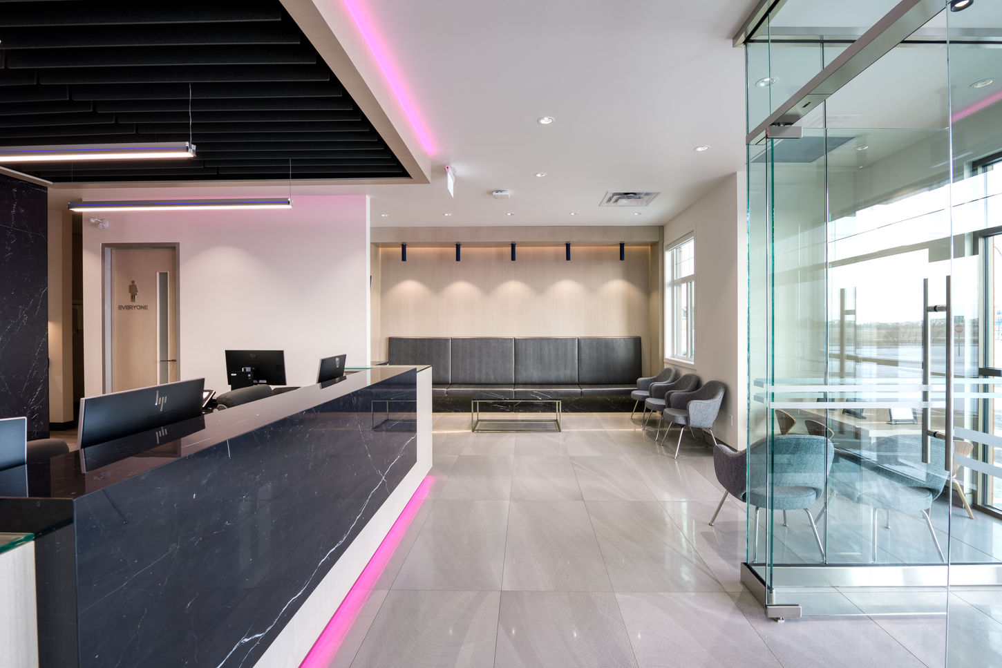 A design highlight for the space is the RGB LED lighting feature at the reception area along with the Turf Design architectural ceiling baffles.