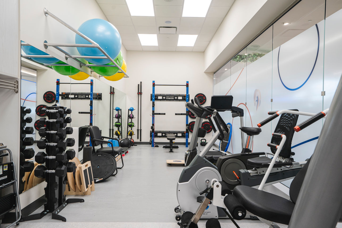 The entire space functional plan is designed about efficient space planning, and optimized services for the patients. The gym is easily accessible from the preparation room which is a galley style room which also opens up to the semi-private treatment areas.