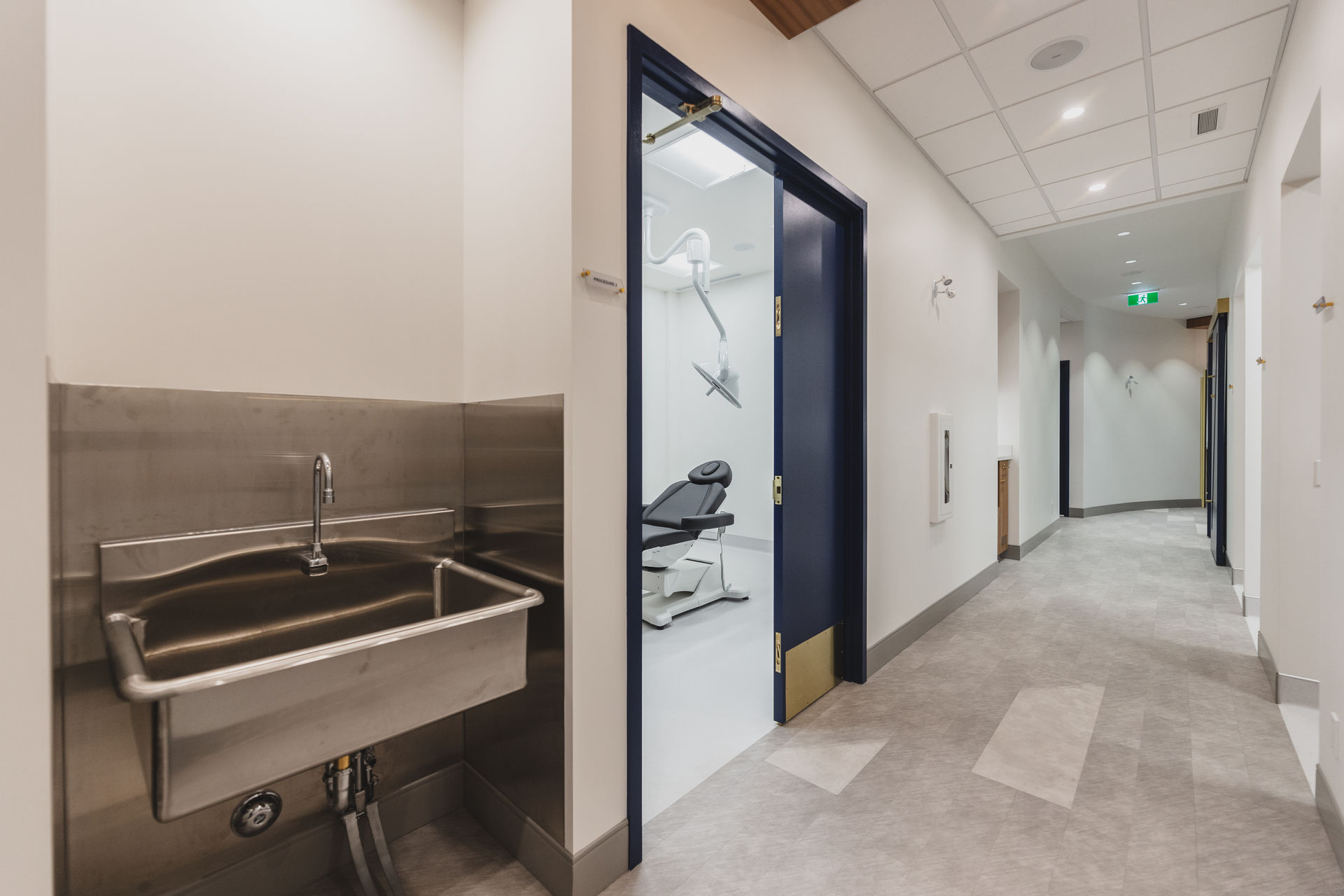 Working with the Client's branding agency, we took cues from the established branding colours to prepare a classic, elegant and timeless material selection of blue, brass, gold and Sapele mahogany woods. Contrasting with the wood, gold and blue was a neutral yet warm large format porcelain tile in the entry along with varying patterns of LVT in the corridors and examination rooms.