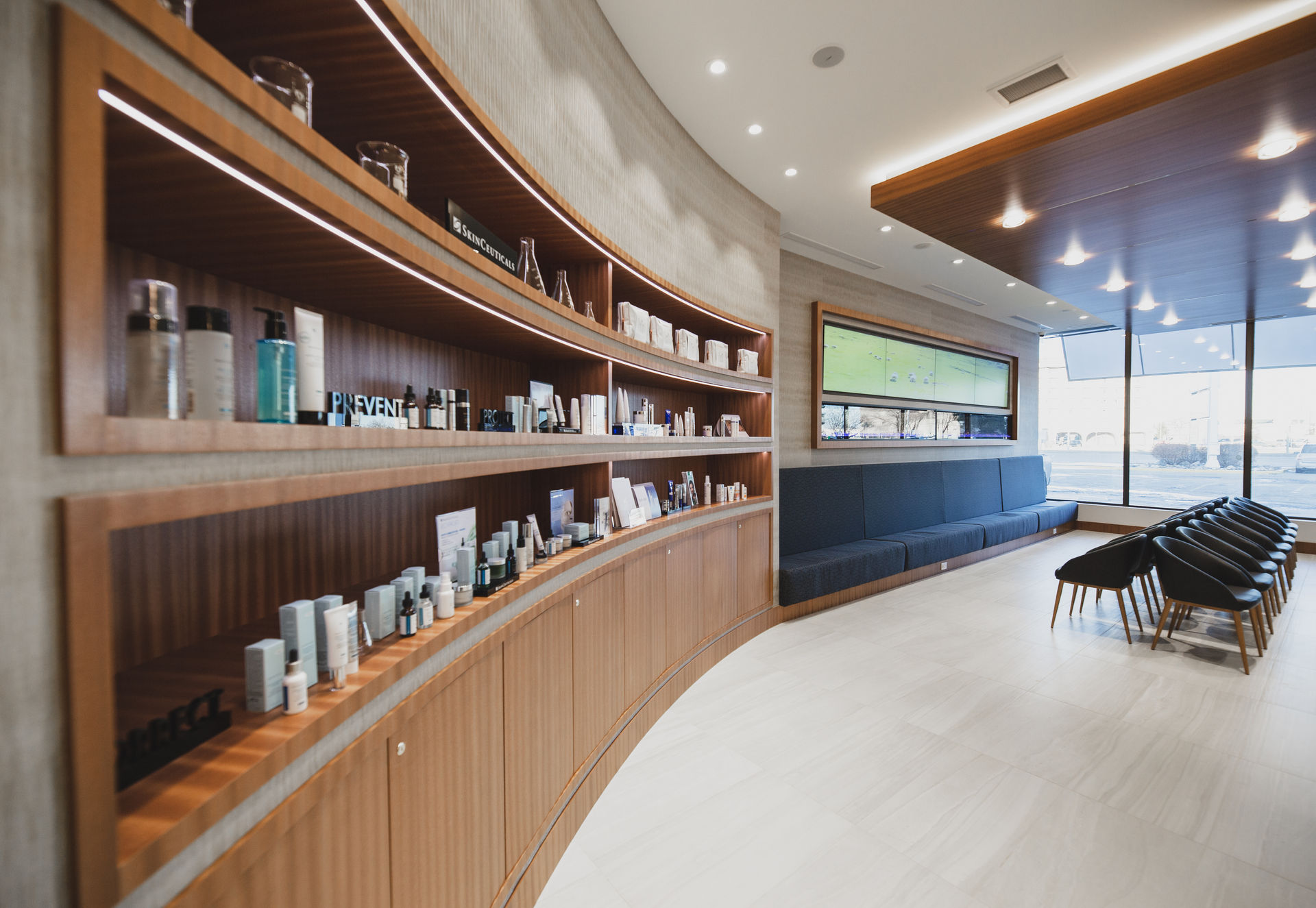 The reception and waiting area are denoted by gentle curves, unique natural cork wallcoverings, a special bench with a 200" linear fireplace feature and a digital market area with four landscape mounted digital monitors to create a striking feature. The curves continue with the boutique visual merchandising of various skincare products.